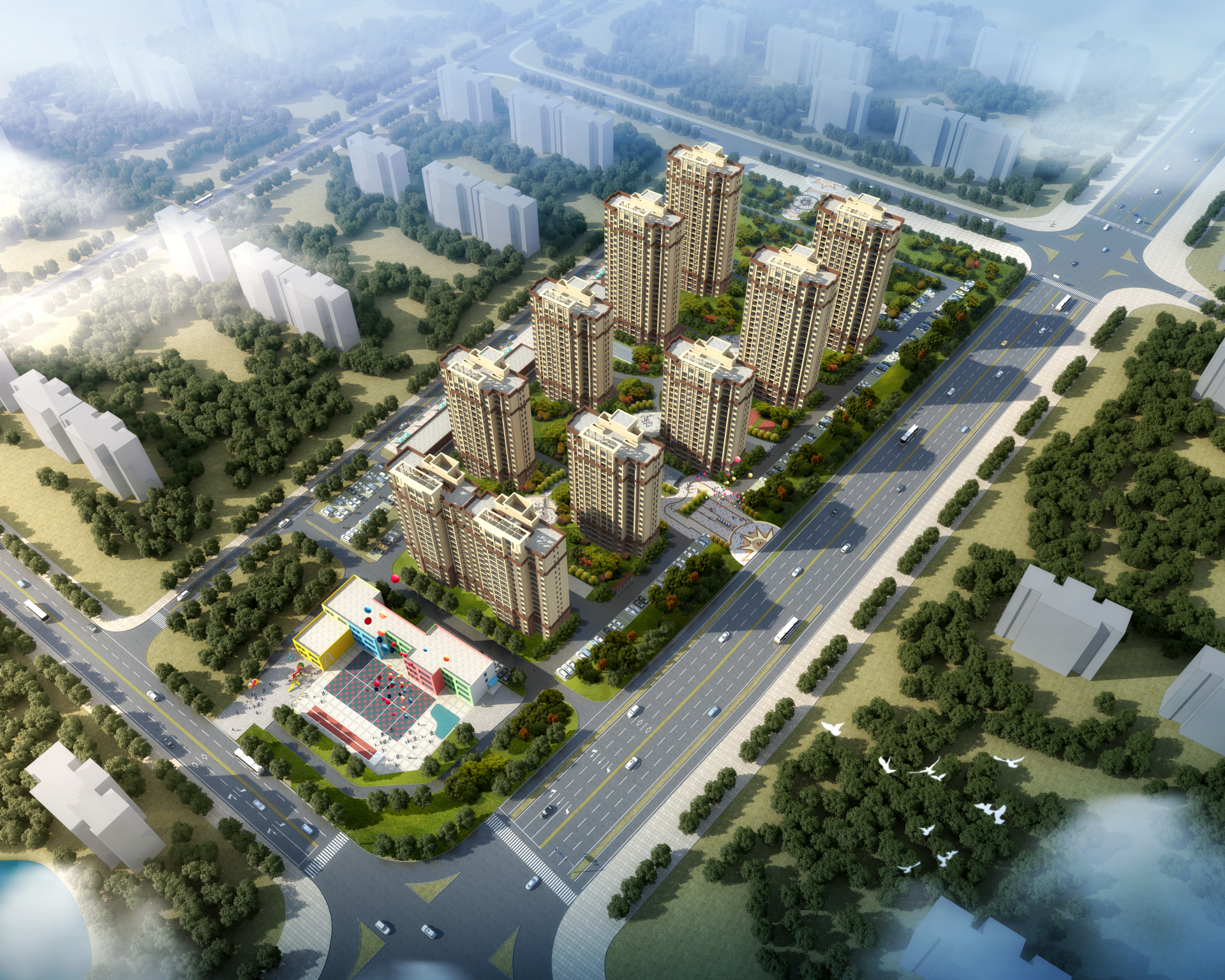 建設規模總建筑面積113267.84平方米 主要由九棟住宅樓、四棟商業、地下室組成