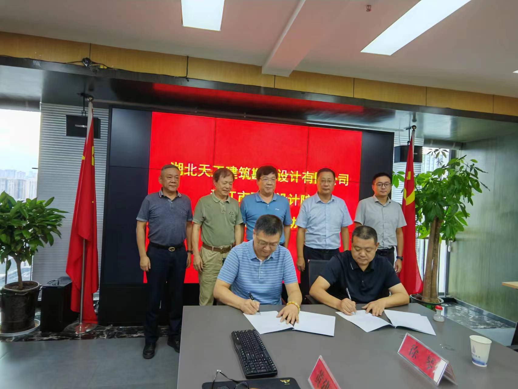 本次簽約儀式由天工院主辦,湖北天工建筑勘察設計有限公司院長車誼與潛江市建筑設計院院長李圣軍分別代表雙方出席簽字并攜多名同事見證戰略合作簽約儀式。